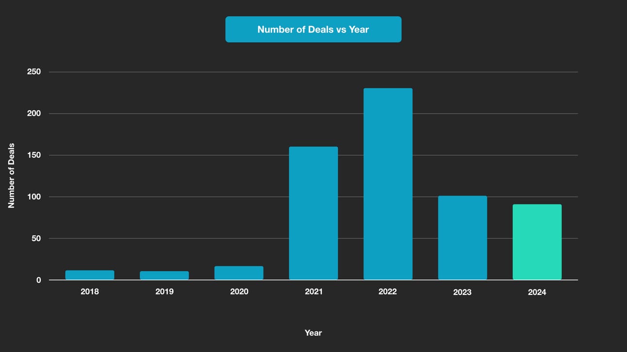 2022 saw the estimated value of deals at almost $700m, which dropped to ~$250m in 2023. In 2024, this number has grown back to over $300m — showing strong growth.