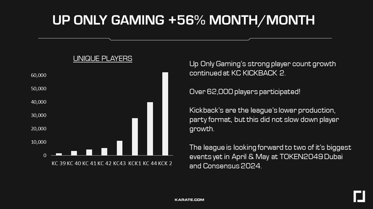 Karate Combat are a more crypto-centric example. Imagine the UFC, but only striking, and rather than a cage, fighters are in a square pit with 45-degree walls on each side. The league in itself is governed by the $KARATE token and rules can be changed via votes, by token holders. The tokens can also be wagered in fights, in no-loss wagers, in their ‘Up-Only Gaming’ model.