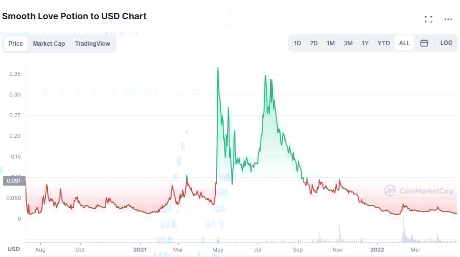 The in-game token in Axie Infinity is called SLP (Smooth Love Potion) and it’s seen a very similar trajectory to most game fuelling tokens; Boom and Bust.