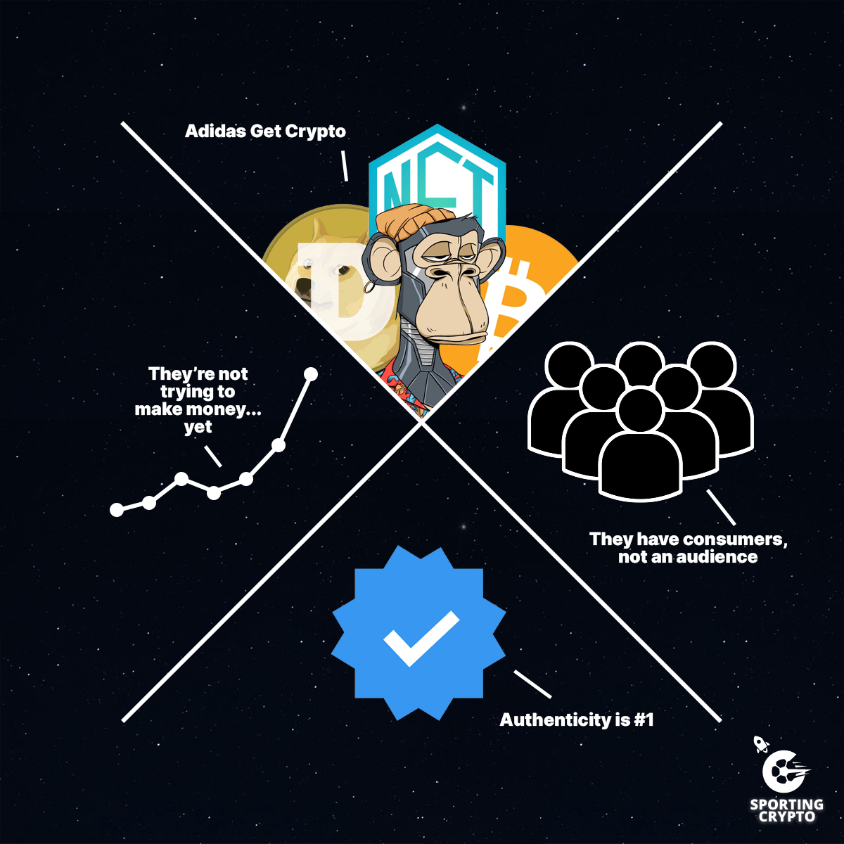 They understand that they have consumers, not an audience. Adidas have understood that they need to build an audience in this space. Right now, they have consumers. A lot of them. Who all buy Adidas garments and sneakers. But they’ve never really had an audience. They’re building one that is crossing over into the crypto sphere, and they’re doing it well. They can then build a community from that audience that they’re creating, that is a combination of their consumers and crypto native people with deep pockets.
