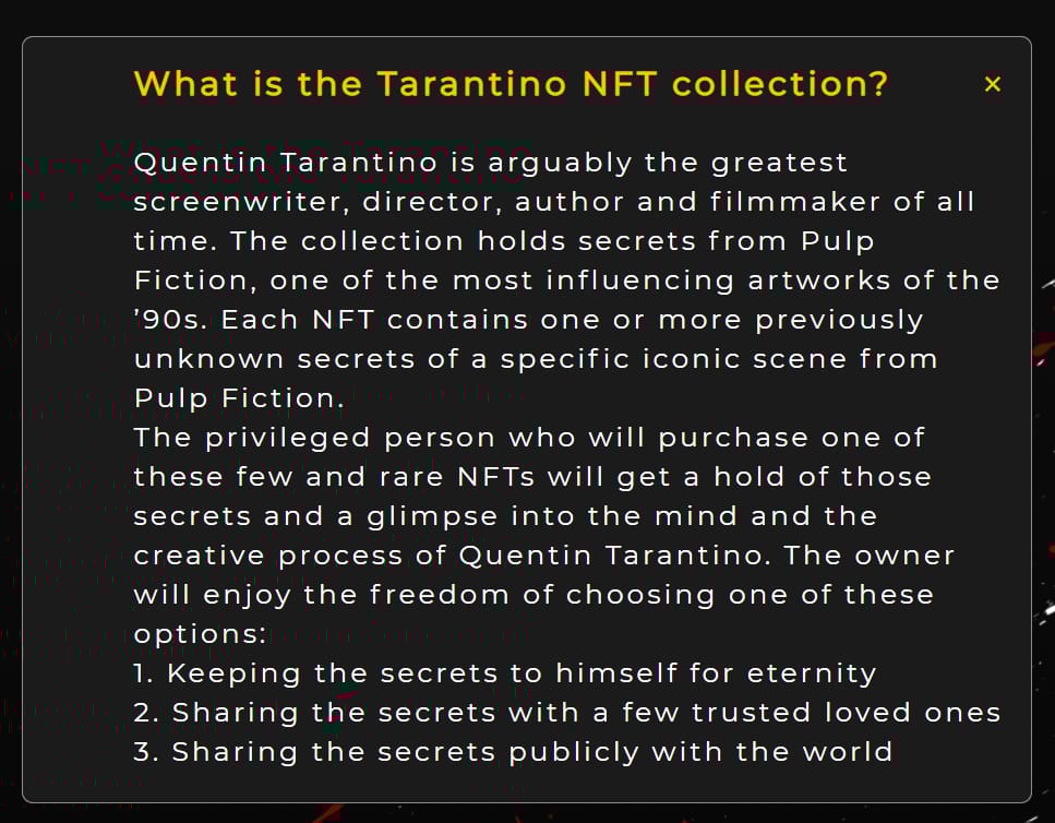 If you haven’t wrapped your head around what the Tarantino NFT collection is going to be, then below is a section of their FAQs.