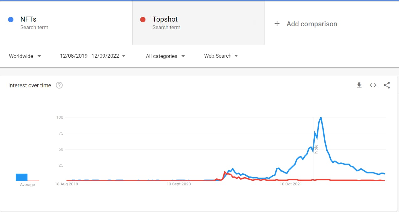 If we look at the graph below, taken from Google Trends, we can see that TopShot was more searched than ‘NFTs’ in late 2020/early 2021.
