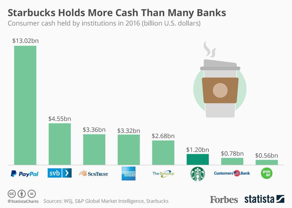 In 2016, they held more cash on their app and Starbucks cards than some banks. That comes from well over 10 million registered users.